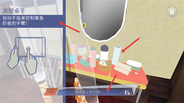 2、進入清理桌子任務后,劃動手指控制章魚奶爸的手臂,清理桌上的雜物,熟悉手臂的操控方式。