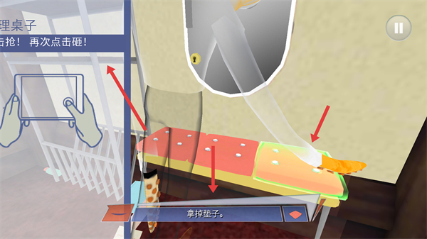 3、按照提示點擊搶后再次點擊砸,拿掉桌子上的墊子,完成桌子的初步清理,為后續操作做準備。