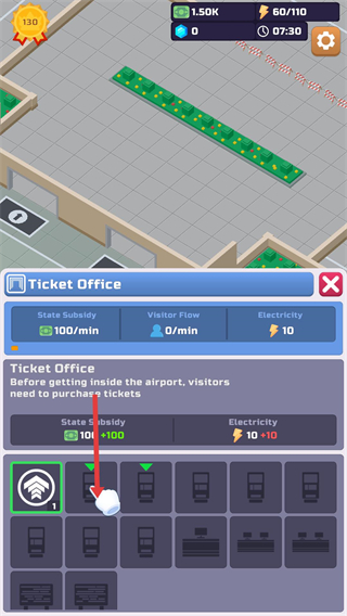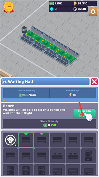4、建造WtingHall候機廳,為旅客提供休息區域,點擊Upgrade升級可提升補貼收益,優化機場服務能力。