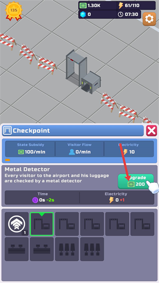 3、部署Checkpoin安檢點,通過金屬探測器完成旅客安檢流程,點擊Upgrade升級可提升設施效率,需消耗資源推進。