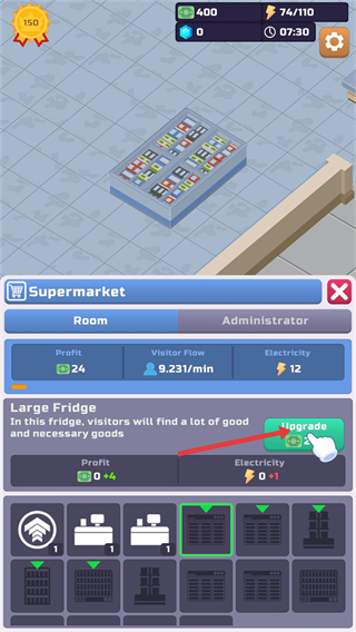 2、在超市界面點擊Upgrade升級大型冰箱,可提升收益加4、電力消耗加1,強化超市的資源供給能力。