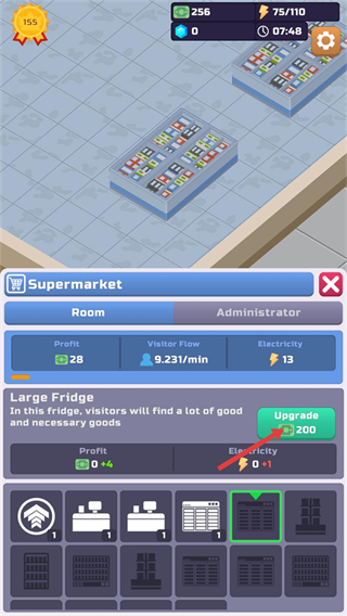 3、再次點擊Upgrade升級大型冰箱,消耗資源提升設施屬性,進一步增強超市的收益效率與服務能力。