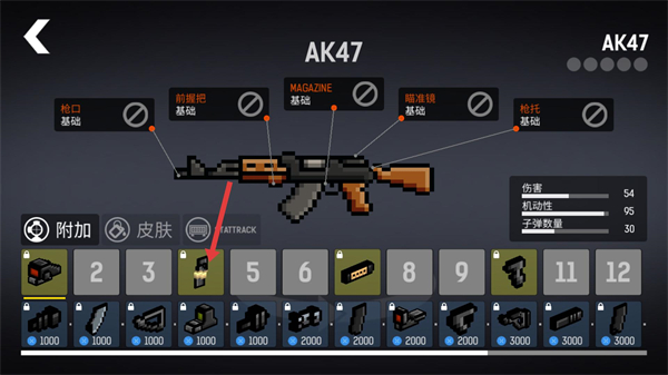 3、進入AK47的改裝界面,可消耗貨幣解鎖槍口、彈匣等附件,提升武器的屬性如傷害、精準度,增強戰斗中的輸出能力。