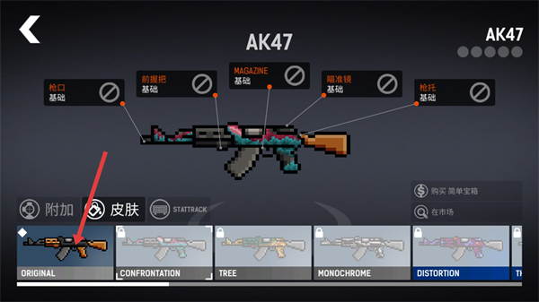 4、切換至皮膚標簽頁,可更換AK47的外觀樣式如CONFRONTATION、TREE等,部分皮膚需通過寶箱或市場獲取,提升武器的個性化展示。