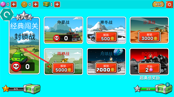 1、點擊封鎖戰進入經典闖關模式,后續關卡如寒冬戰、沙漠戰需消耗對應資源解鎖,可按進度逐步拓展關卡類型。