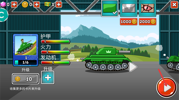 2、在坦克升級界面,可提升護甲、火力、發動機等屬性,消耗資源強化坦克能力,點擊右下角按鈕可進入戰斗流程。
