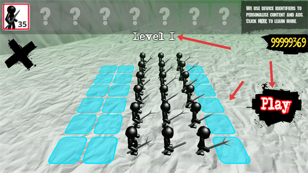 1、在Level1界面點擊右側Play按鈕開始游戲,可看到己方持矛小人陣列,需合理部署他們來應對戰斗。