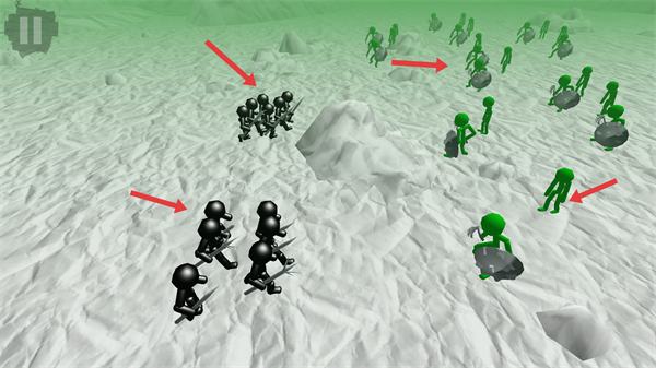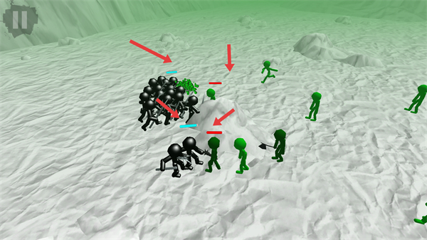 3、面對大量持盾和不同武器的綠色小人,需分兵應對,讓己方小人團隊從不同方向發起進攻,逐個消滅敵人。