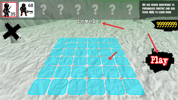 4、完成前序關卡后進入Level3界面,點擊Play按鈕開啟新關卡,可部署小人在藍色方格區域,準備迎接更具挑戰的戰斗。