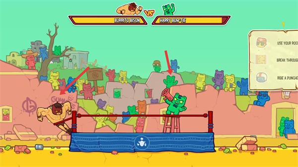 1、游戲開始時操控角色從擂臺沖出,進入場景后注意周圍的軟糖熊敵人,準備展開戰斗和推進。