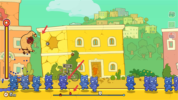 3、當角色落地后注意剩余的藍色軟糖熊敵人,同時關注左側的火箭能量條,為后續使用火箭技能做準備。