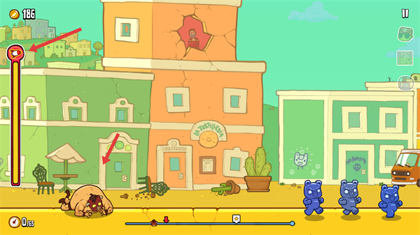 2、在奔跑過程中操控角色撞擊建筑物獲取道具,同時躲避藍色軟糖熊的追擊,積累推進的距離和資源。