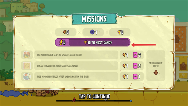 4、在任務界面查看需要完成的任務,如使用火箭slam粉碎軟糖羅杰等,通過完成任務獲取糖果和獎勵,提升角色能力。