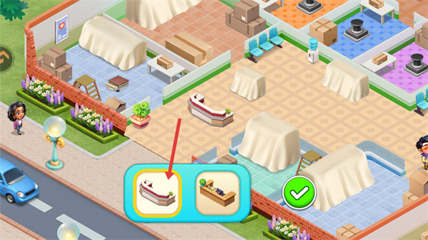 2、在醫院場景界面,選擇前臺類設施進行布置,完善醫院的接待區域,為后續接診病人搭建基礎功能模塊。