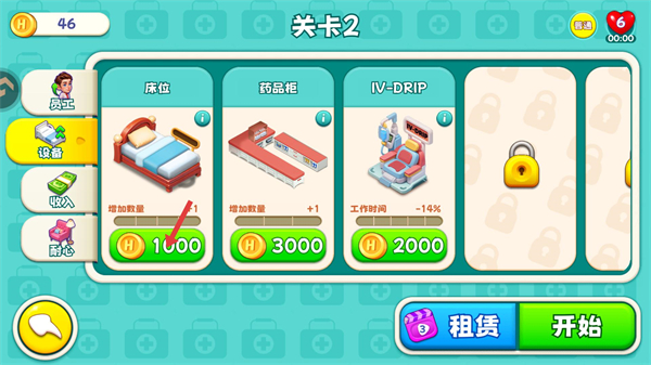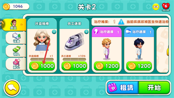 3、在關卡2資源界面,消耗1000金幣租賃托盤插槽,提升醫院的運營輔助能力;同時可配置員工來增強工作效率。