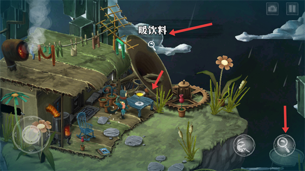 2、游戲場景中需尋找暖飲料可利用右下角放大鏡功能查看細節,仔細觀察場景中的物品,找到制作暖飲料的相關元素。