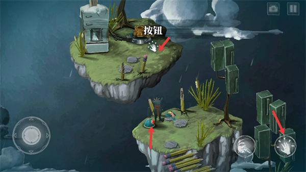 3、遇到按鈕時需點擊互動同時可利用右下角手掌圖標進行操作,在不同平臺間移動,觸發場景中的機關和事件。