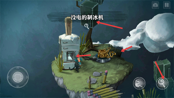 4、面對沒電的制冰機要探索場景尋找供電方法,利用放大鏡功能觀察制冰機和周邊設備,找到恢復供電的關鍵元素。
