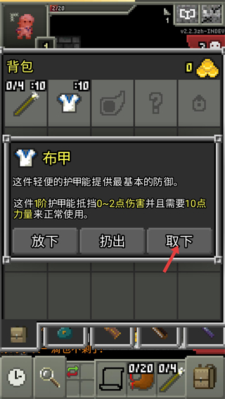 4、在背包中選擇布甲,點擊取下可卸下該裝備,也可更換其他護甲,根據戰斗場景靈活調整防御配置。