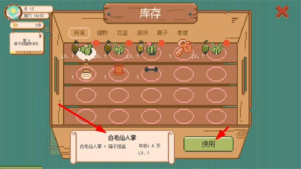 2、打開庫存界面,選擇白毛仙人掌,點擊使用按鈕,將該植物布置到窗臺區域,拓展窗臺的綠植種類。