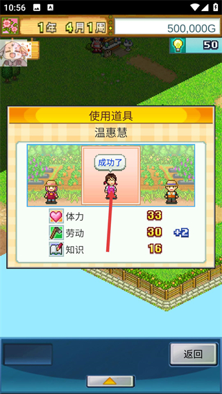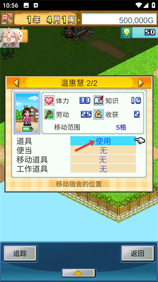 2、在角色界面點擊使用按鈕,進入道具選擇頁面,可通過道具提升角色體力、勞動、知識等屬性。