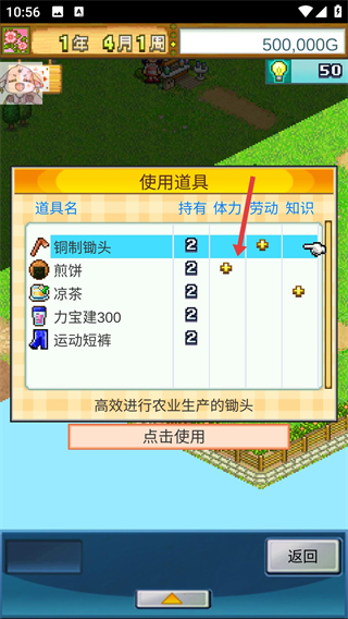 3、選擇銅制鋤頭等目標道具,點擊點擊使用,可針對性提升角色對應屬性。