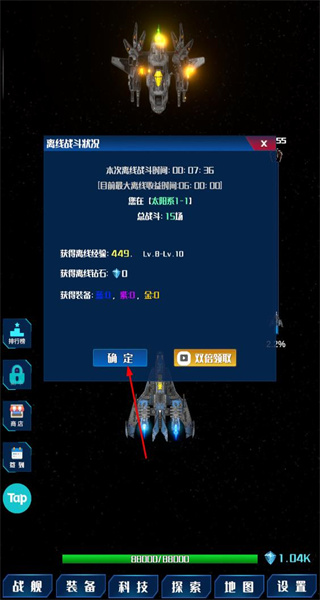 2、在戰斗結算界面,顯示獲得的經驗、鉆石等獎勵信息,點擊確定按鈕,關閉結算彈窗,回到游戲主界面。