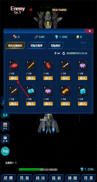 4、在裝備商店界面,展示多種可購買的裝備,找到目標裝備的購買按鈕,點擊購買,提升戰艦的戰斗能力。