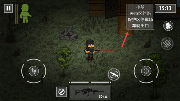 3、進入保護區場景后關注界面上的地點提示如保護區停車場等,利用虛擬按鍵操控角色移動探索場景,收集資源同時警惕敵人的出現。