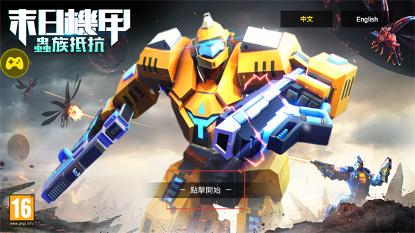 1、進入游戲看到帶有巨型機甲和蟲族的啟動界面,選擇中文后點擊按鈕開始,開啟科幻風格的動作射擊冒險之旅。