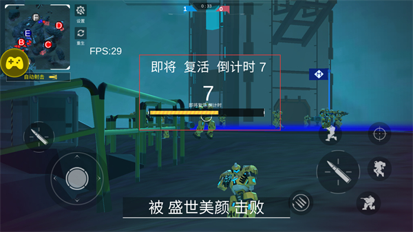 4、戰斗中若被擊敗,會出現即將復活倒計時,倒計時結束后重新加入戰場,繼續投身人類與機器人的激烈對抗。