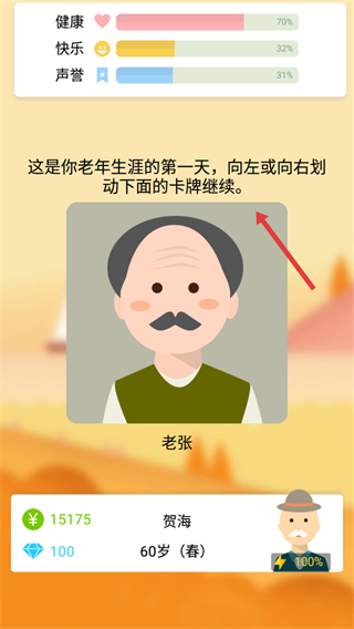 2、進入游戲后可看到健康、快樂、聲譽三大屬性,老年生涯第一天需向左或向右劃動卡牌繼續,同時關注自身金錢和鉆石資源。