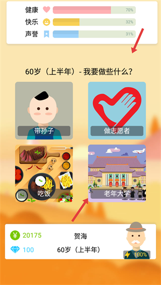 4、在60歲上半年的選擇界面可選擇帶孫子、做志愿者、吃飯、上老年大學等活動,不同選擇會影響屬性和資源,需結合自身需求選擇。
