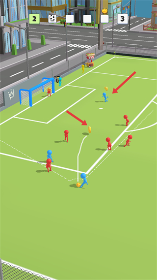 1、進入游戲先觀察場上道具和紅色對手位置,然后規劃傳球或帶球路線,盡量把路線畫在有金幣和帶鑰匙隊友的方向,向對方球門推進。