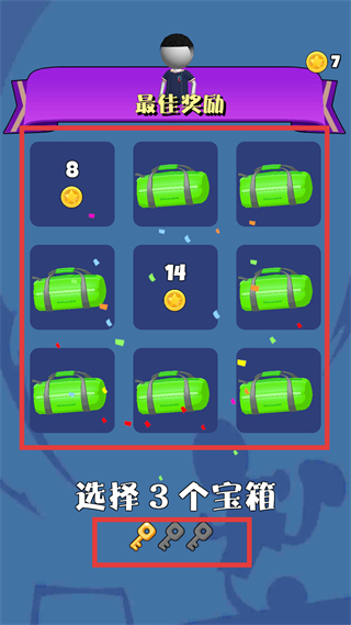 4、進入最佳獎勵界面,有多個寶箱和金幣獎勵,使用獲得的鑰匙選擇寶箱,開啟寶箱獲取獎勵提升游戲進度。