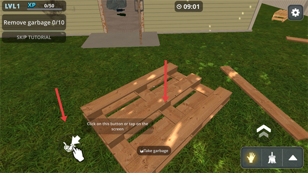 2、進入后院后要完成清除垃圾的任務,點擊左下角帶有工具圖標的按鈕或點擊屏幕,對木托盤等垃圾執行Takegarbage操作,逐步完成垃圾清除目標。