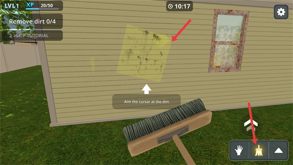 3、接下來處理房屋污垢點擊右下角掃帚圖標切換工具,將光標對準黃的色標記的污垢區域,進行清掃操作,完成清除污垢的任務。