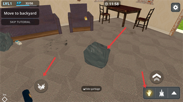 4、進入房屋內部后切換到右下角手掌圖標工具,對室內的灰色大垃圾執行Takegarbage操作,同時也可利用左下角工具圖標按鈕輔助完成垃圾清理任務。