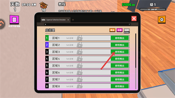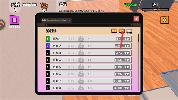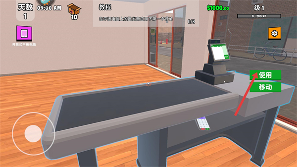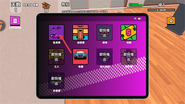 1、點擊柜臺設備的使用按鈕,進入平板電腦界面,該設備是訂購玩具車、管理店鋪的核心工具,需通過它完成教程訂單任務。
