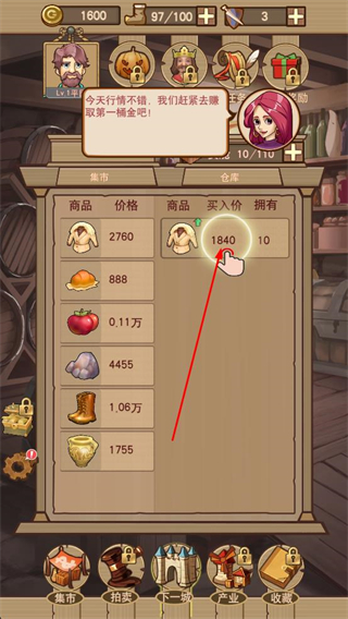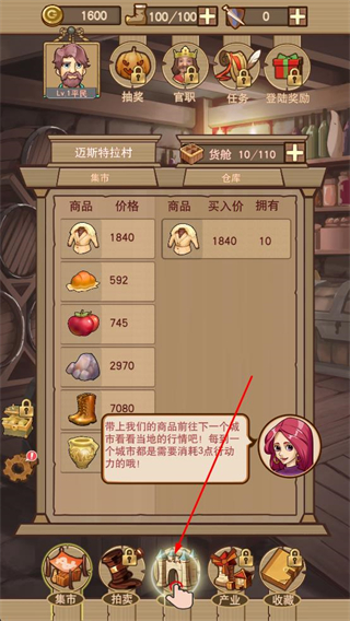 1、打開平民崛起記游戲進入邁斯特拉村集市界面,查看各類商品價格,根據提示準備前往下一個城市銷售商品,點擊下方城市按鈕切換地點。