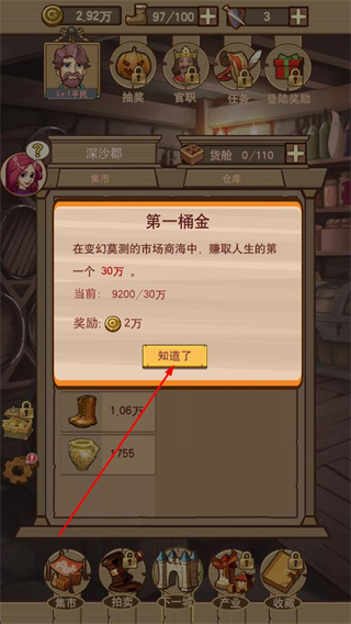 4、交易完成后查看第一桶金進度提示,了解當前收益與目標的差距,點擊知道了按鈕關閉提示,繼續進行貿易。