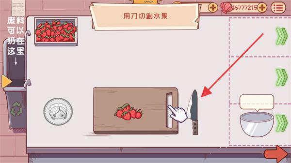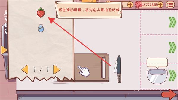 2、滑動屏幕將對應水果移動至砧板,完成材料的轉移操作,方便后續的切割步驟,推進飲品的制作流程。