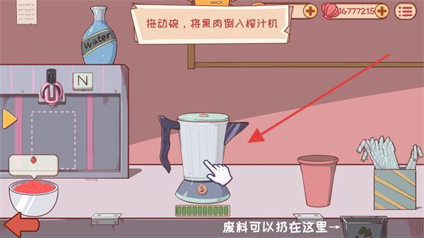 4、拖動碗將處理好的果肉倒入榨汁機,啟動榨汁流程,同時注意在過程中加入適量的清水。