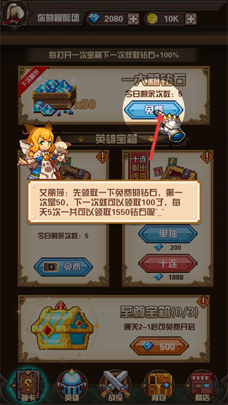 2、先領取一大箱鉆石的免費獎勵,每日可領5次且獎勵遞增,累計能獲取1550鉆石,這是初期重要的資源來源。
