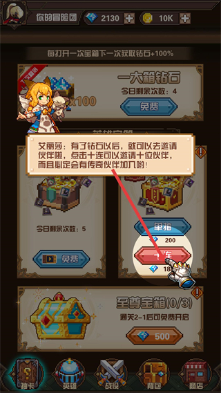 3、消耗鉆石進行十連招募,十連必出傳奇伙伴,能快速提升團隊強度,是前期組建強力隊伍的高效方式。