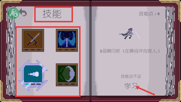 3、例如在技能頁面,可查看十字劍、特殊攻擊等技能,當技能點足夠時點擊學習,掌握如1級瞬閃斬等技能,可以提升戰斗能力。