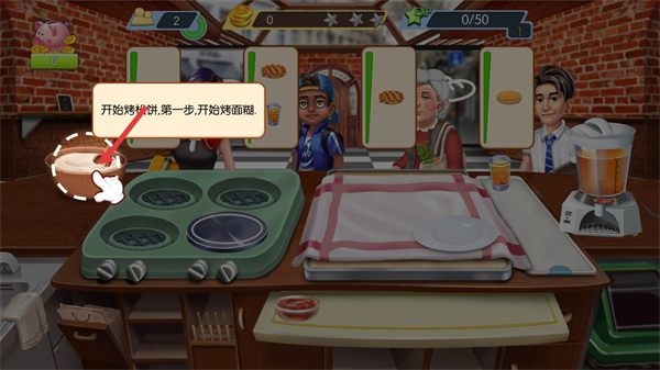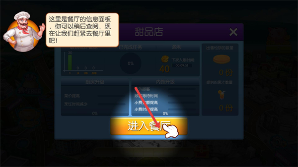 1、點擊進入餐廳開啟甜品制作流程,這是進入烹飪場景的前置操作,后續需按步驟完成菜品制作以滿足顧客需求。