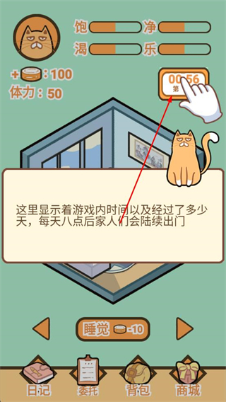 1、打開飼養人類模擬器游戲進入游戲主界面,查看游戲內時間及貓咪狀態,了解每天八點后家人們會出門的規則,點擊時間區域確認信息。