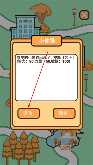 4、遇到野生小偷貓,查看其技能屬性,點擊進攻按鈕發起互動,推進游戲內的事件流程。