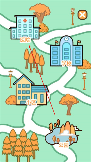 3、返回主界面后進入地圖頁面,瀏覽小區醫院等地點,選擇醫院位置,進入對應的場景區域。